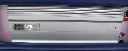 これもアルパインのアンプで、SPLでアルパインが日本記録を出した時に使用したV12シリーズのアンプです。ブリッジで接続して900Wくらいです(こんなにいらないからゲインはだいぶ絞った状態ですけど)。購入してすぐに1507というグレードアップ版が同じ値段で出てやがんの。もうちょっと待てば・・・。まあ、そんな事言ったらいつまで経っても買えないけど・・・